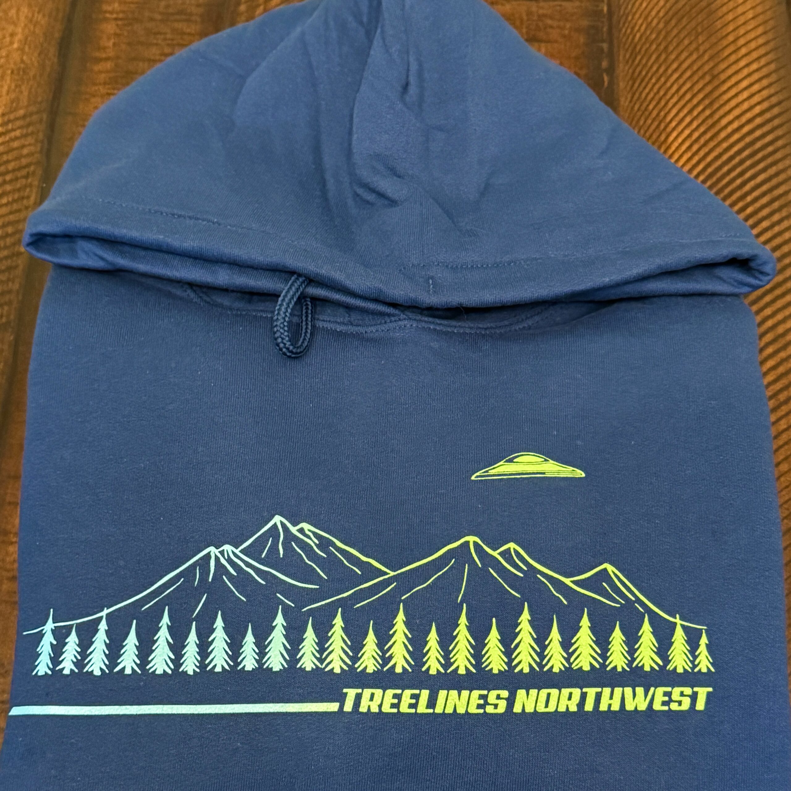 Local lore states the first saucer was seen over our local mountains. Turned out to be a cap cloud, but still pretty cool! A classic bar hoodie in PNW marine blue with our Mountain craft print front an center with a blue to green fade.