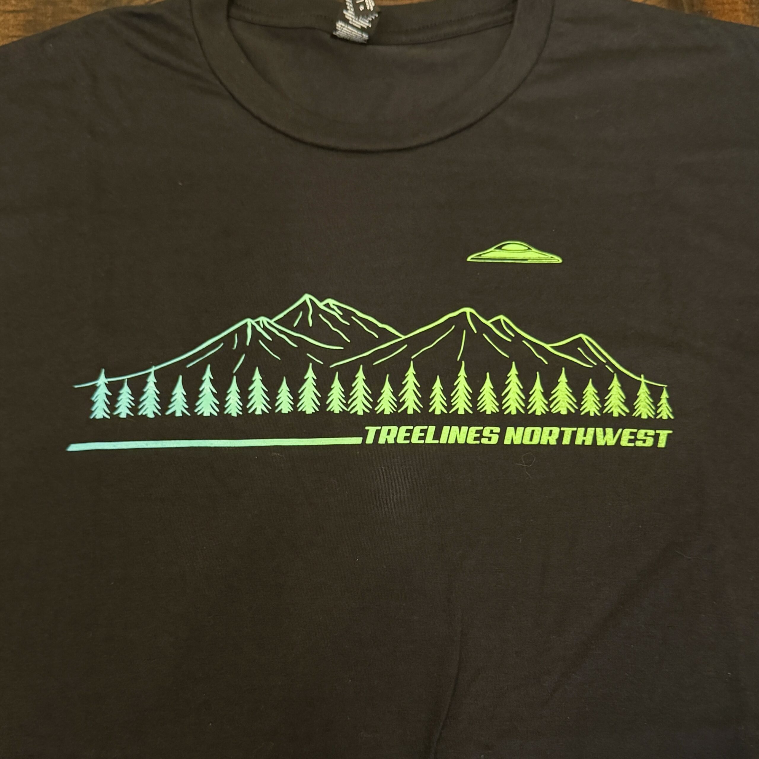 Our Mountain Craft Tee. 10 inch wide graphic on front chest, hand screen printed in a blue green fade on a solid black Men’s Tri-blend T shirt.