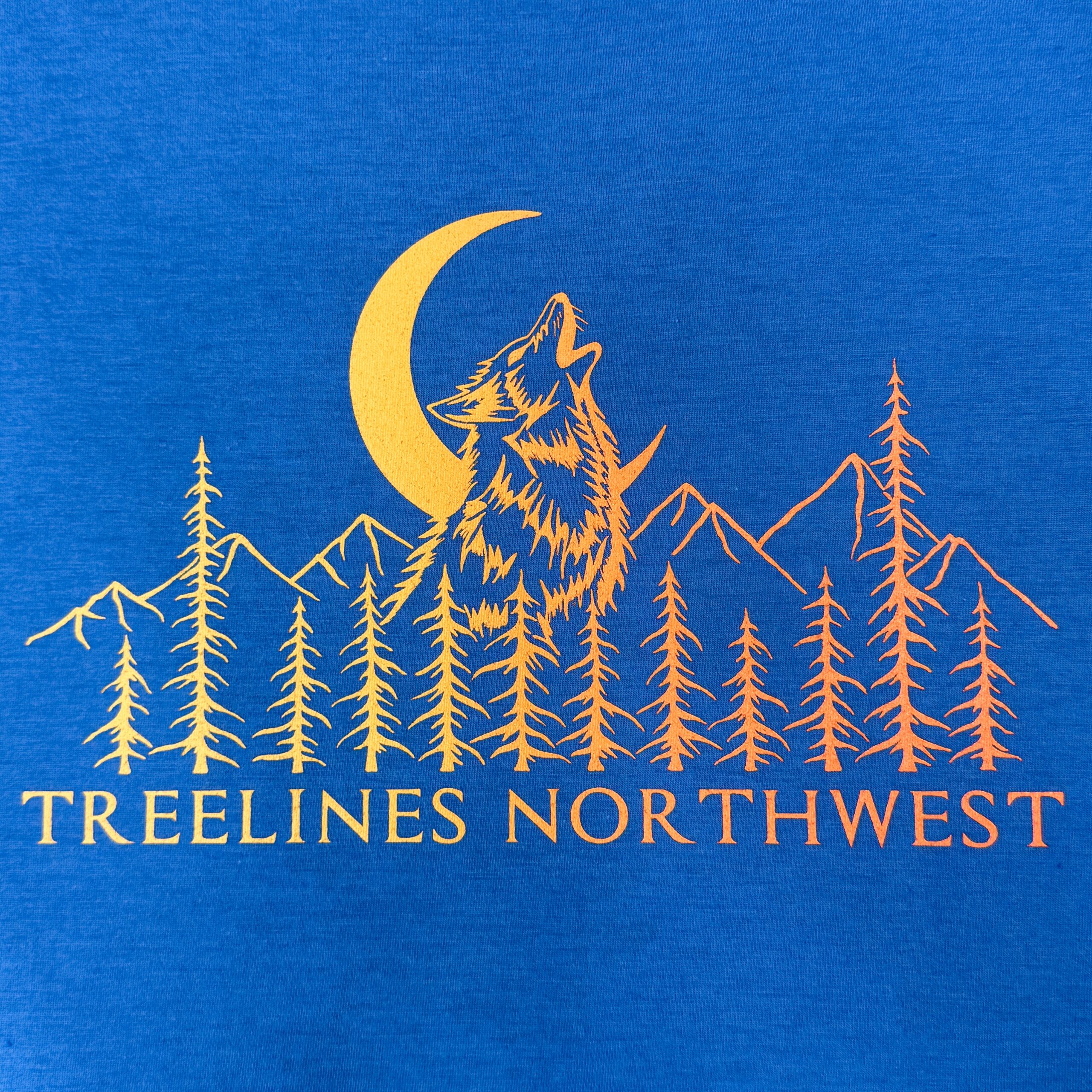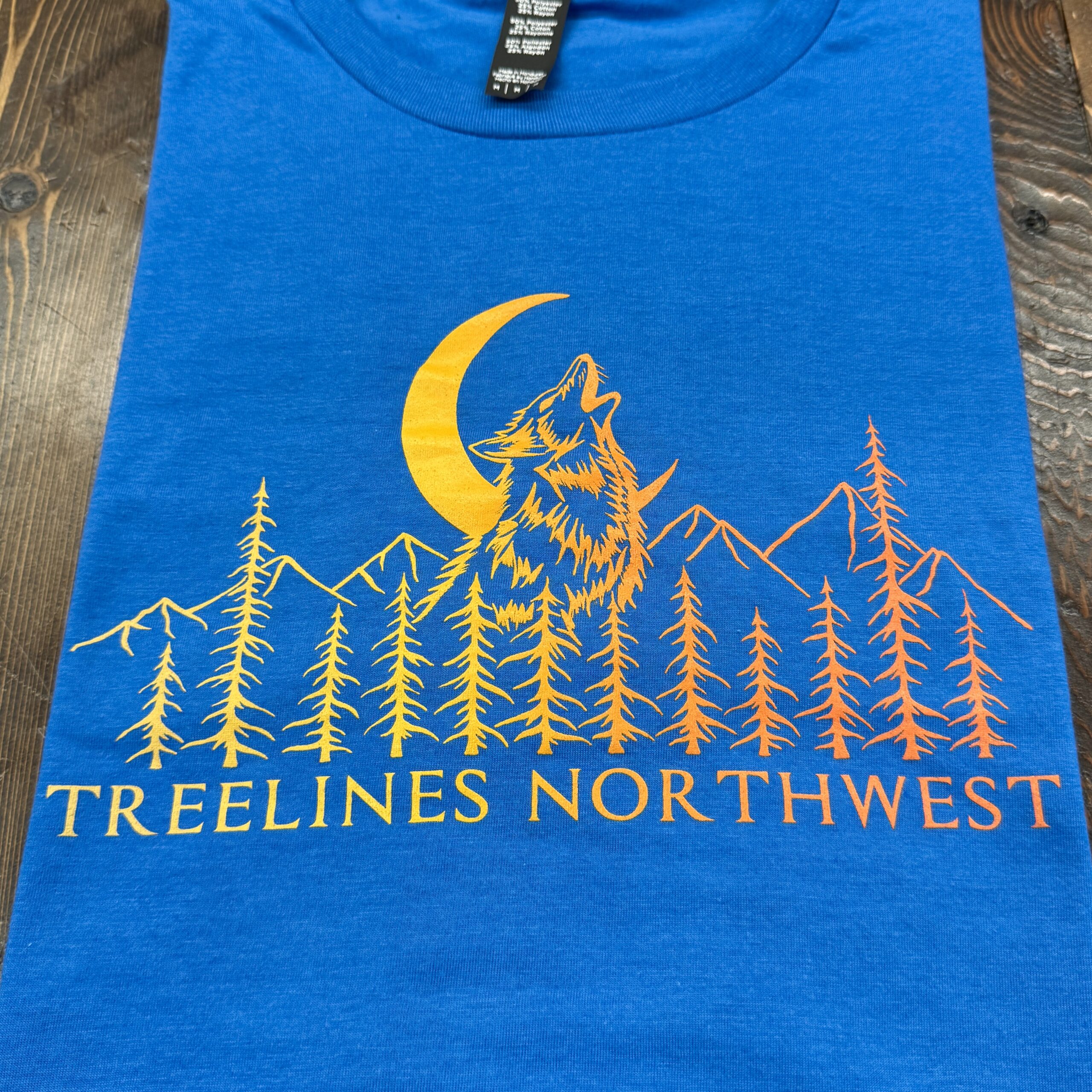 Stealth wolf. 10 inch wide graphic on front chest, hand screen printed in a faded Gold and Orange ink on a Pool Blue Men’s Tri-blend T shirt.