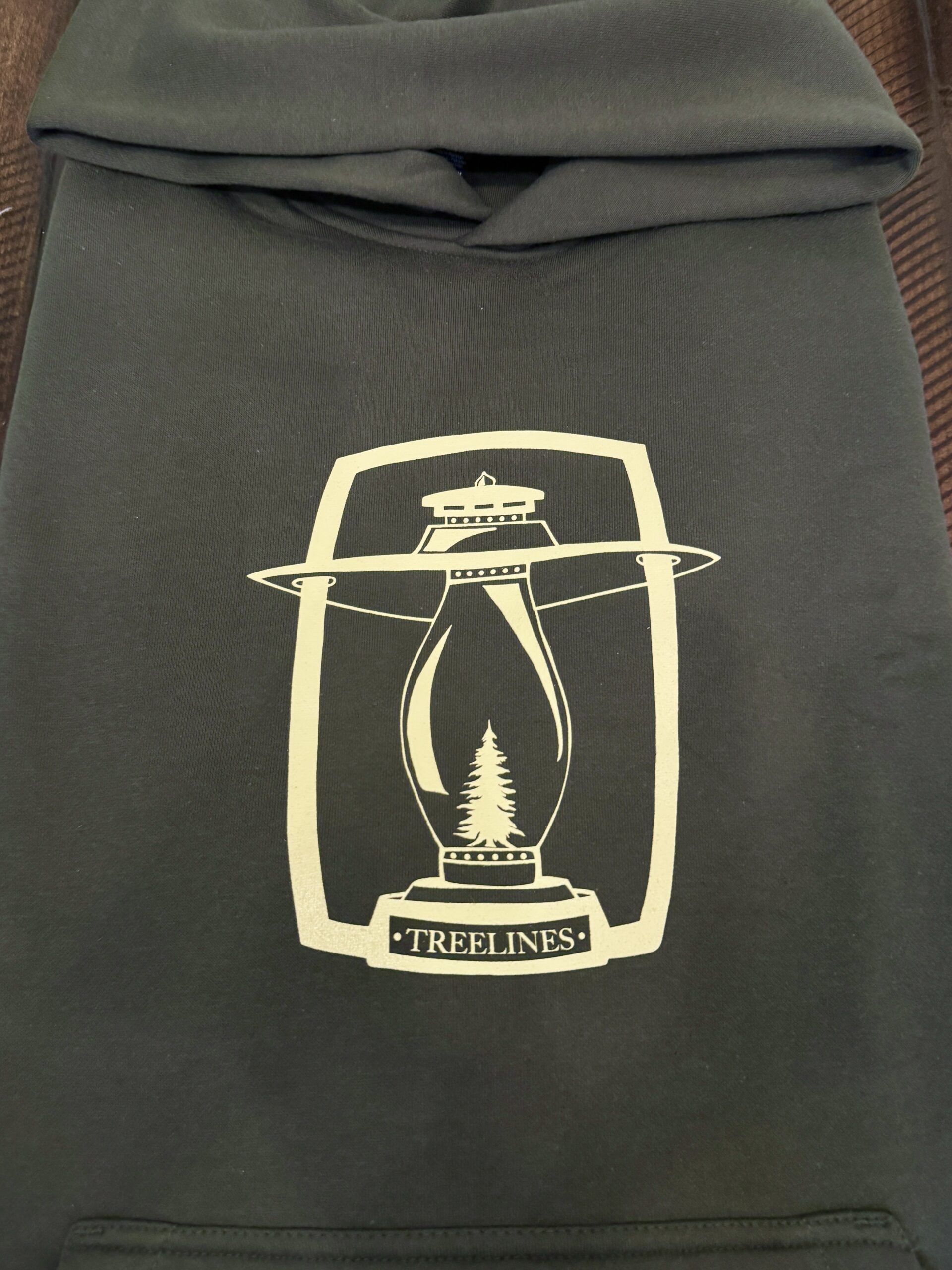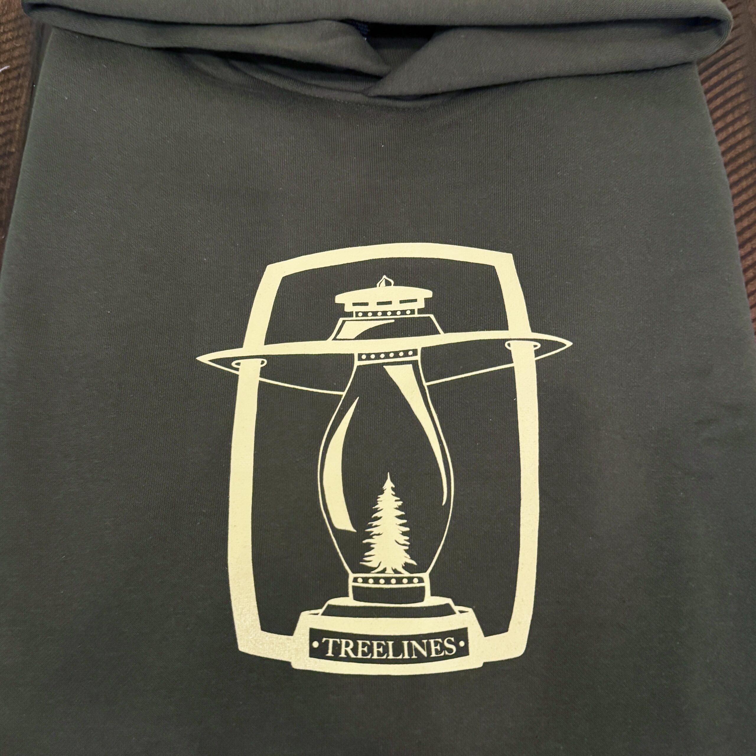 One of our original designs from way back. Clean 9 inch tall hurricane lantern printed in khaki on a dark green cozy oversized fit hoodie.